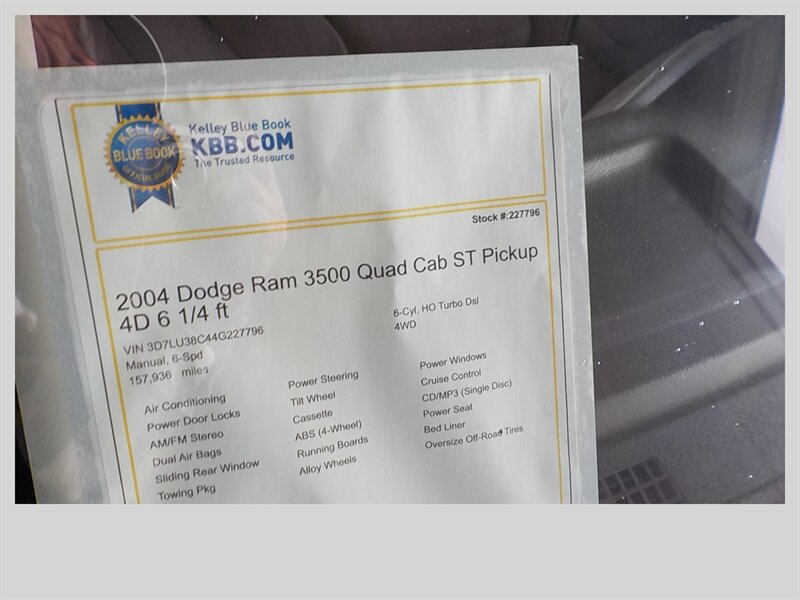 --- 5.9L HO CUMMINS TURBO DIESEL! -- 6-SPEED MANUAL TRANSMISSION! -- 1-TON SINGLE REAR WHEEL! -- NEAR NEW ALL TERRAIN TIRES! --- THIS DODGE 3500 QUAD CAB 4X4 LONG BED SLT 4X4 IS IN EXCELLENT CONDITION! RARE 6-SPEED MANUAL TRANSMISSION! LOADED WITH SLT EQUIPMENT AND DRIVES LIKE NEW! ---------------------- CALL OR EMAIL & BUY IT NOW! ----------------------- SPECIAL INTERNET PRICE! -- $22,777.00